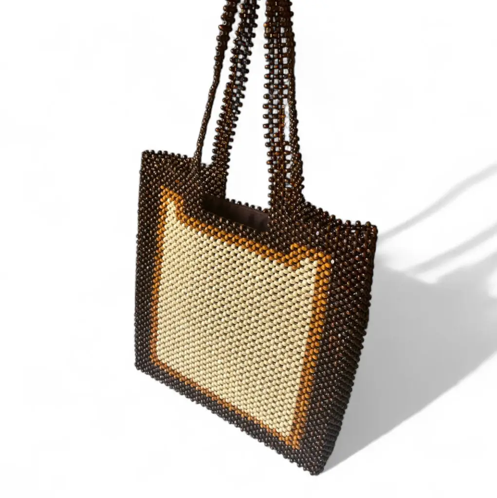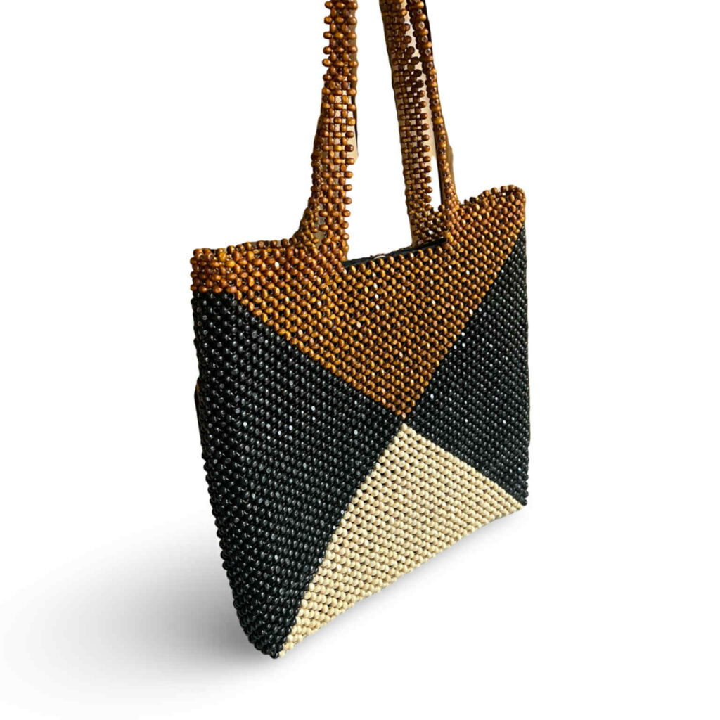 Carefully handmade with tightly woven beads, featuring a structured shape and beaded handles for a refined, artisanal finish.
