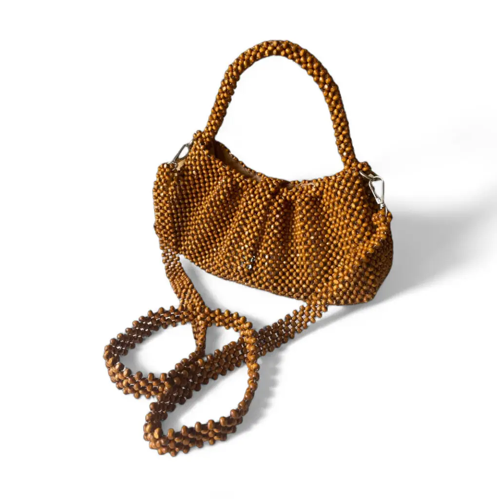 Handcrafted from individually strung beads, woven to create a softly structured silhouette with a curved form. Designed with a beaded top handle and a detachable beaded sling, secured with metal hardware for flexibility and support. Lightweight yet durable, made for hand-carry or optional crossbody wear.