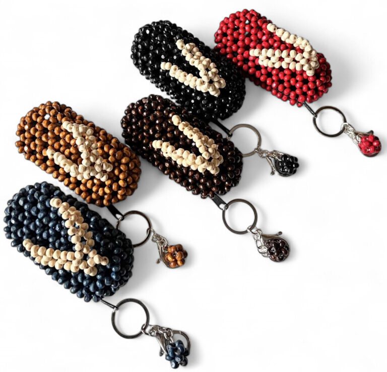 Handcrafted from individually strung beads, shaped into a playful flip-flop silhouette with a compact, structured form. Finished with a secure zip closure and a metal key ring with charm for easy attachment. Lightweight, durable, and ideal for coins and small essentials.